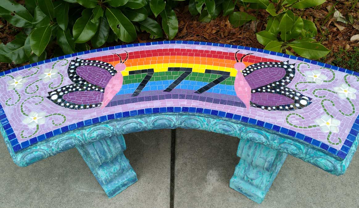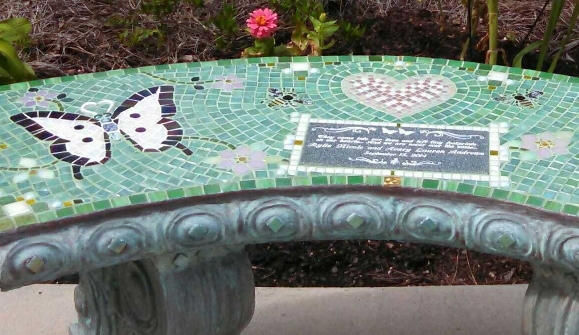 “The visual detail of our bench is remarkable. Linda was very attentive to the details, and truly incorporated the colors and symbolism that represent our daughters. The various patterns and textures of the tiles compliment one another beautifully and truly make for a custom design. The bench is a perfect addition to our memorial garden– we couldn’t be any happier.”
